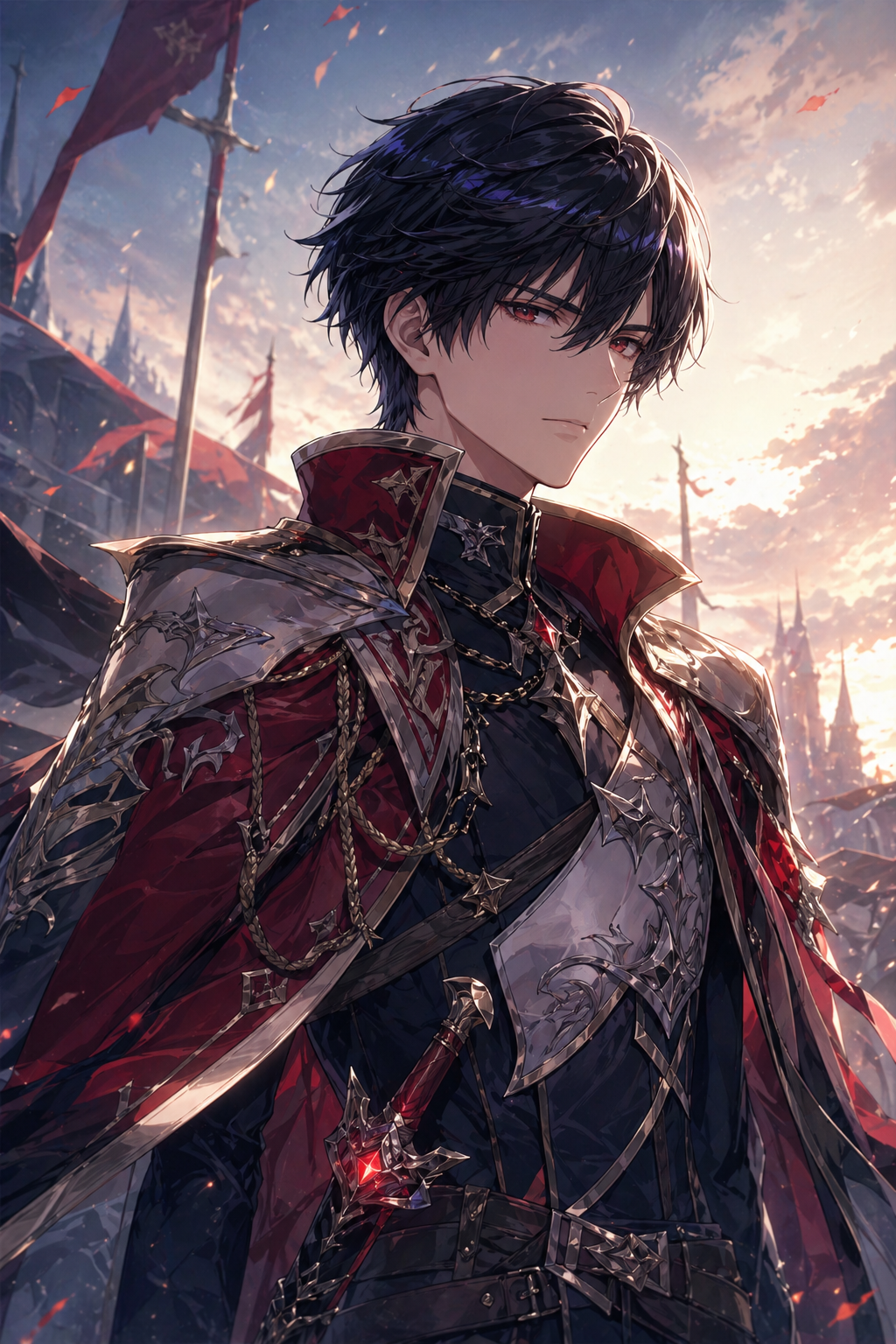 codex exec "에리히 후반부 일러스트 생성. 검은 머리 붉은 눈, 붉은 망토와 은빛 갑옷, 노을지는 폐허 도시 배경, 약간 멜랑콜릭하고 결의에 찬 표정"