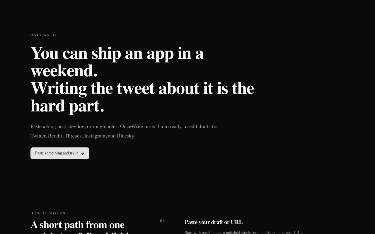 Paste a post and get five versions: Twitter thread, Reddit post, Threads post, Instagram caption, Bluesky post. Each platform has its own tone. Twitter gets bold, Bluesky gets quiet confidence, Reddit gets honest and humble. No manual tone selection needed.
